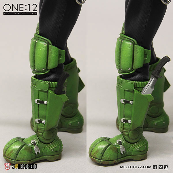 One:12 Collective 判官爵德 附有透明面罩(特別符號的頭盔)、質地均勻緊貼皮服裝、腰帶配件(可以容納手榴彈和彈藥)、配備了皮套和刀鞘長靴、靴刀、手銬、Rougiba(執行武器槍)、警棍、兩枚手榴彈、可以替換拳頭左右1組和展示架、支持輔助等等豐富配件,尺寸高約有17公分,售價約14,580元日幣,喜歡漫畫JUDGE DREDD 判官爵德的玩具人可以參考一下歐!