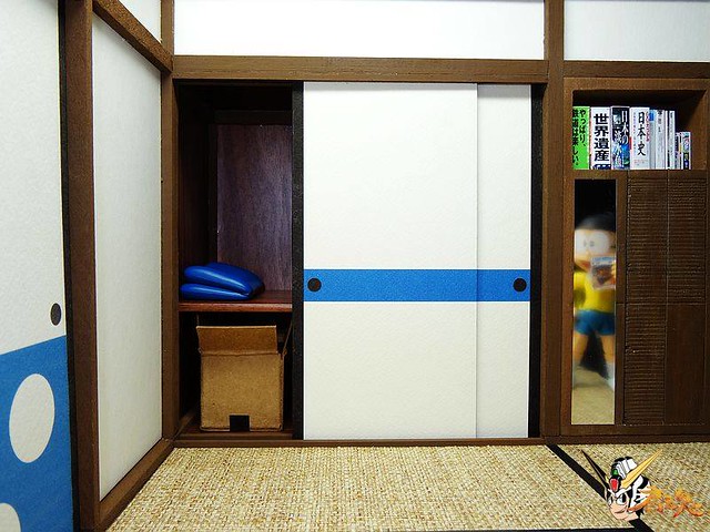 右半邊為小叮噹睡覺的櫥櫃與衣櫃,櫥櫃牆面做法一樣,只是差在多貼上木紋貼紙。抓好適當高度後製作隔板,隔板建議要有足夠厚度,避免被小叮噹壓壞變形,使用足夠硬的厚紙板或堆疊來完成,衣櫃部分利用飛機木畫好格式,再利用筆刀刻線,鏡子可以利用鋁片來模擬,這樣房間就大致完工了。