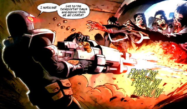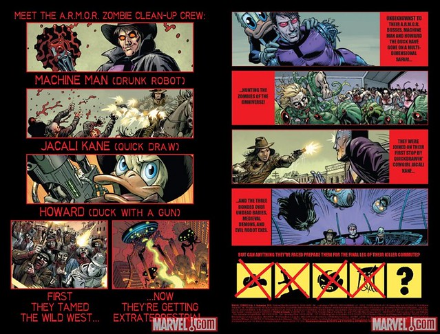 神鎧領導者 Portal 則派出兩個機人 Jocasta(奧創妻子的那位女機人,不知道各位還有印象嗎?)和 Machine Man 去活死人世界收集制做血清所需要的樣本,但包含他們在內,所有神鎧人員不知道的事情是,真正的墨比斯被關在自己的基地房間裡,而跟眾人交談的則是活死人版墨比斯偽裝的。