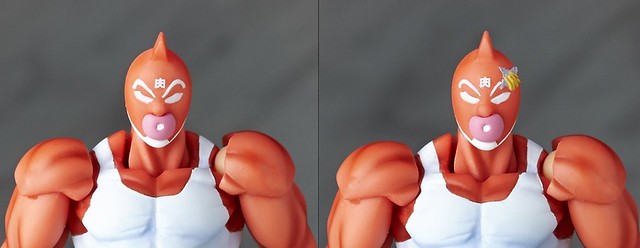 這次配件附有兩款不一樣的頭部配件,一個是面具破裂露出特泰利的金髮、多款可以替換手首和可以讓金肉人對應的吃牛丼的左、右手首等等配件,金肉人系列的角色人物就是要收集越多人物一起互相對應把玩,才會更有趣味啊!