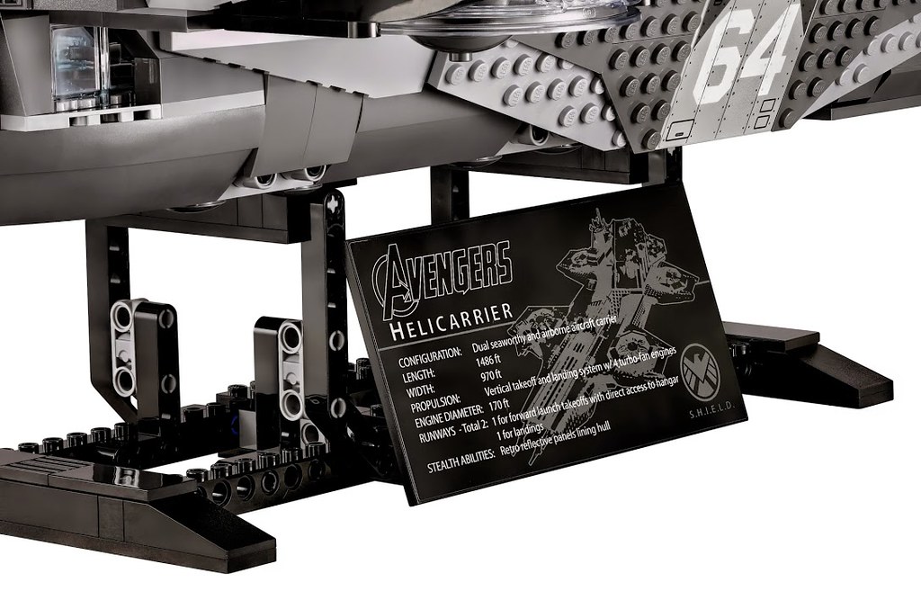 最酷的地方是,這台「神盾局空中航空母艦總部」有著許多的機關裝置,包括可連動式的螺旋風扇引擎,接上LEGO® 專屬的馬達後就可以自動旋轉,而打開航空母艦的夾板後,也可以看到控制中心的呈現,各位可以將所附送的12 支microfigures 擺放在這個部位。最後,為了讓整體呈現的造型更加完美,這次LEGO® 設計了一款搭載著神盾局LOGO 的minifigures 人偶擺放台。