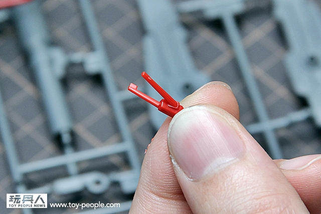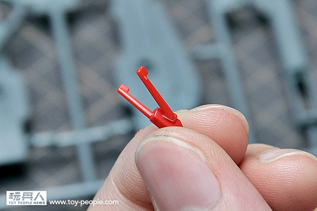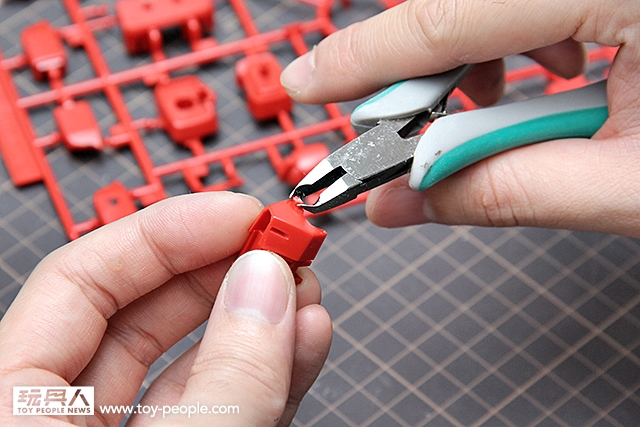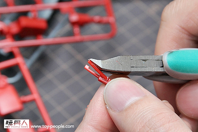 ▼ 剪好之後,在進行第二次的修剪。請盡量留下一點點跟零件的距離。因為無論在厲害的斜口鉗,多少都會造成零件剪裁口的推擠,造成白化的出現。所以建議各位,盡量避免用斜口鉗貼平零件修剪湯口,而是留下一點點湯口…。