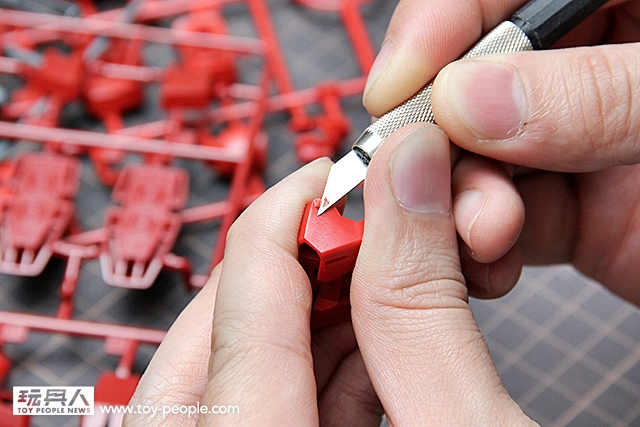 ▼ 留下的湯口,我們就使用筆刀來削除。這時候,要使用適合削物件的厚刃筆刀,厚刃筆刀,在削的時候比較不會崩裂或斷損。而使用筆刀的好處是,單方向的削切可以減少白化造成的影響。