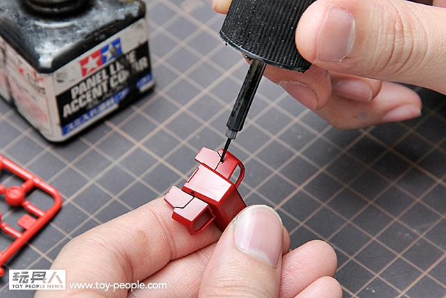 ▼ 當你取下,零件後,就可以準備上墨線囉。上墨線的地方就是將墨線液,點在機體外表,明顯線條細節的部分。因為這樣機體看起來會有立體感,細節也會更明顯。點的時候,可不是用筆刷去畫。而是盡量以垂直的方件點進去,墨線液就會因毛細現象,自動跑起來。墨線線條會更加一致,並且流動的速度變得快一點。