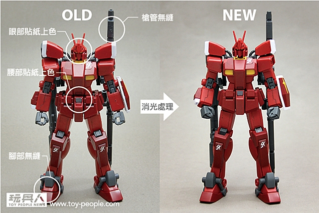 ▼ 這一次我們開盒製作是使用最簡單的素組方式進行的。想要知道怎樣的可以做得更精緻嗎?就像喬老師這樣做做看吧。可以針對單色貼紙的部分,捨棄貼紙直接上色,槍管跟四肢比較容易有接縫的地方,就可以使用無縫處理,最後在噴上一層消光漆。新舊差別一覽無遺囉!