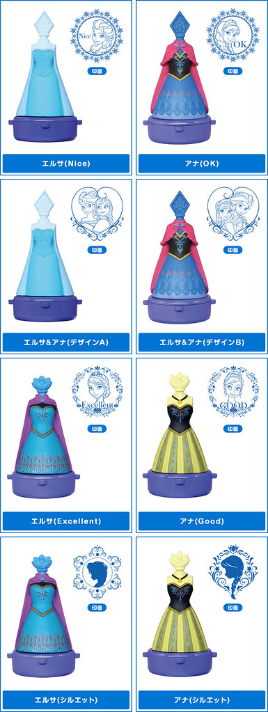 這次將要推出的「冰雪奇緣造型印章」共有四個造型八種款式:「艾莎Nice 版」(エルサ Nice)、「安娜OK 版」(アナ OK)、「艾莎與安娜A 款」(エルサ&アナ デザインA)、「艾莎與安娜B 款」(エルサ&アナ デザインB)、「艾莎Excellent 版」(エルサ Excellent)、「安娜Good 版」(アナ Good)、「艾莎側影版」(エルサ シルエット)、「安娜側影版」(アナ シルエット)。