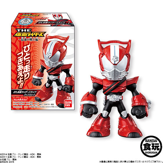 日Bandai萬代玩具公司的食玩部門事業部預計今年2月將推出THE 仮面ライダーズ 最速の戦士編 假面騎士 最速的戰士編 的盒玩商品,取名為“最速的戰士”篇顧名思義將假面騎士當中各種以“速度”為取向的騎士收錄,有三位平成假面騎士的假面騎士Drive type Speed(仮面ライダードライブ タイプスピード)、假面騎士Fourze(仮面ライダーフォーゼ ベースステイツ(ポージングVer.))、假面騎士KABUTO(仮面ライダーカブト ライダーフォーム(ポージングVer.))和一位昭和假面騎士X(仮面ライダーX)。