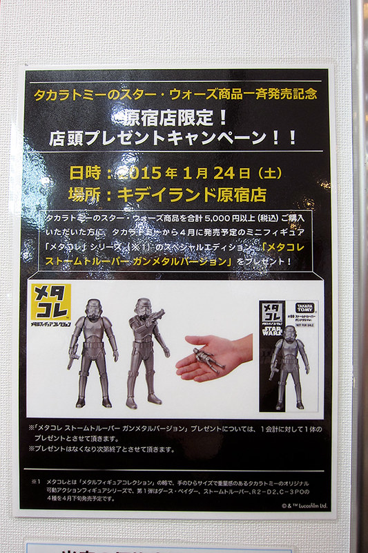 在今年都還沒推出的Takara Tomy玩具公司的《星際大戰》メタコレ系列,沒想到在日Kiddy Land原宿店(キデイランド原宿店)舉辦購買星戰系列商品滿5,000元日幣,就送一個メタコレ#00ストームトルーパー ガンメタルバージョン,編號00 沒上色的金屬版本《星際大戰》帝國暴風兵。
