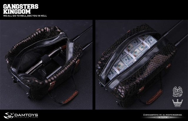 配件除了搭配裝了大量美金的行李箱之外,還配備有火力強大的烏茲衝鋒槍以及散彈槍,服裝則是一身酷黑配上仿蛇皮材質大衣,充滿殺氣的硬派造型相當精采!各位《黑幫王國》粉絲怎能不入手?!