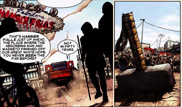 Hammer Falls(鎚子隕落地)位於拉斯維加斯,是 Amerika 第一知名的觀光景點。通常參觀和來祭拜的旅客群,都是希望英雄們能夠歸來的民眾,而攤販都賣些超級英雄的週邊紀念產品(只要有賺錢,總統不會管賣什麼東西)。這裡被提及是萬磁王跟某些反派消滅英雄偉大白色希望(暗指雷神索爾)的地方,此區域由反派 Hammerhead 所擁有。