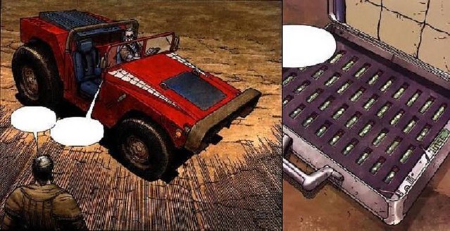他們在後車廂裡面裝有大型的直立機槍,可以按鈕出來,讓駕駛在座位上直接當作機槍砲台使用;鷹眼的包裹,裡面是九十九劑超級士兵血清,鷹眼打算交給反抗政府的勢力,讓復仇者傳奇再現(自己也要求成為其中一名超級士兵),但沒想到交涉人卻是紅骷髏的神盾便衣幹員,並將他殺害,而這些超級士兵血清也被帶到白宮去。