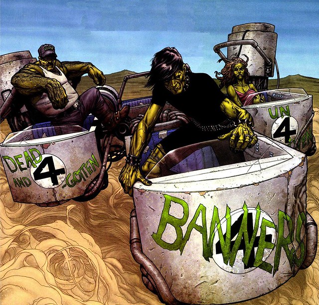 在加利福尼亞引起的原子彈爆發事件,導致布魯斯吸收過多的輻射,使得他腦部受損,變成極度瘋狂的暴力殺人魔。他將自己的表妹女浩克當作母體,生出一推愛吃人肉的子孫而組成浩克幫。