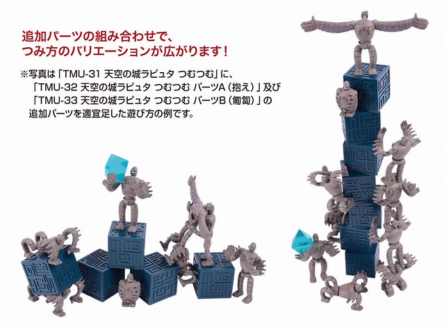 並附有故事當中的出現的飛行石(立方体)和飛行石(結晶)兩種搭配把玩機器人兵 疊疊樂,同時還會推出天空の城ラピュタ つむつむ パーツ TMU 32【パーツA(抱え)】和天空の城ラピュタ つむつむ パーツ TMU33【パーツB(匍匐)】兩款,單款售價約850元日幣,可以用來擴充更多機器人兵 疊疊樂裡面的數量,提供給喜歡宮崎駿大師動畫電影系列的玩具人參考。