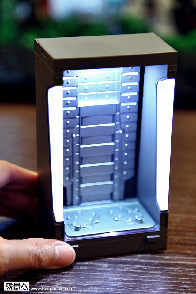 ▼ 格納庫的造型相當紮實,並且擁了大量的造型細節,把電影中的場景完整Q版再現!燈光的開關隱藏在左下角的凸起處,按下即可發光,完全不影響整體造型。發光效果相當的棒,亮度足夠、均勻,加上格納庫內部上方還有一個投射燈,以及地板的間接照明。絕對是展示鋼鐵人的最佳超值配件!