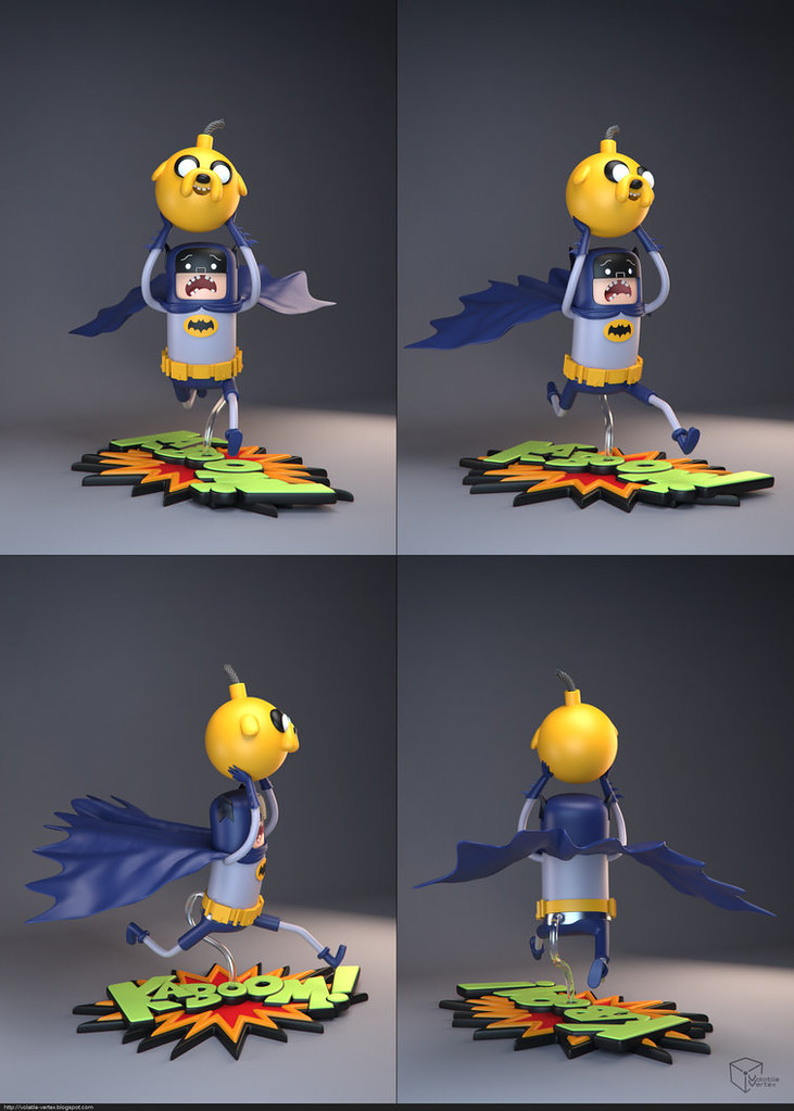 知名卡通頻道(Cartoon Network)旗下目前最火紅的卡通「探險活寶」(Adventure Time)一直受到許多玩具人的喜愛,過去推出過的玩具商品也造成熱烈的搶購。當然,這麼熱門的卡通也讓許多的玩家或是設計師將他改造成不同風格的作品,而這次來自英國的Volatile-Vertex 的設計師則是將探險活寶結合了蝙蝠俠推出一系列3D 的造型。