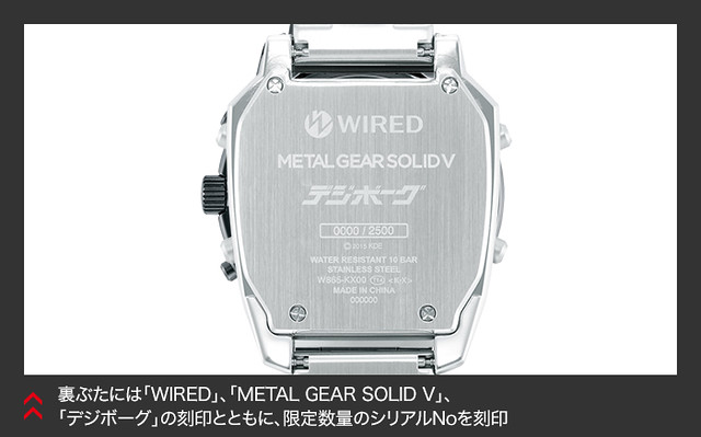 在《潛龍諜影:幻痛》全新的遊戲中,主角SNAKE 可以使用新的道具“幻影雪茄”(Phantom cigar)來任意的跳躍到自己想要的時間帶,以利任務的執行。遊戲中所使用的手錶造型與介面,是出自於日本知名的手錶廠牌SEIKO 於1980年代所推出的電子錶「DIGIBORG」。而為了這次的聯名,KONAMI 這次特別與結合機能與時尚的品牌系列「WIRED」合作,推出這一款全新造型的復古錶款。