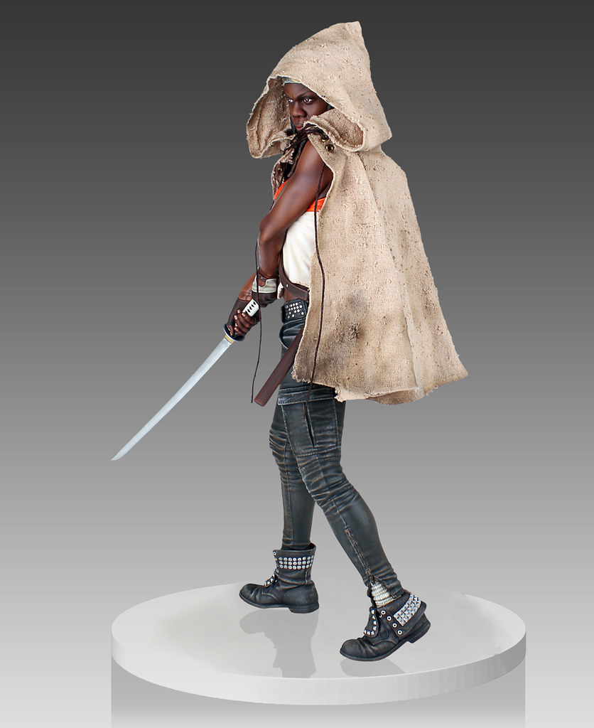這次將要推出的「米瓊恩」(Michonne)造型是其初登場時,披著斗篷揮舞著武士刀的版本,這次所推出的雕像作品,在其斗篷的製作是採用真實的布料所製作的,因此各位玩具人可以隨時將斗篷取下改變戰鬥姿態。喜歡這個角色的玩具人請不要錯過了!