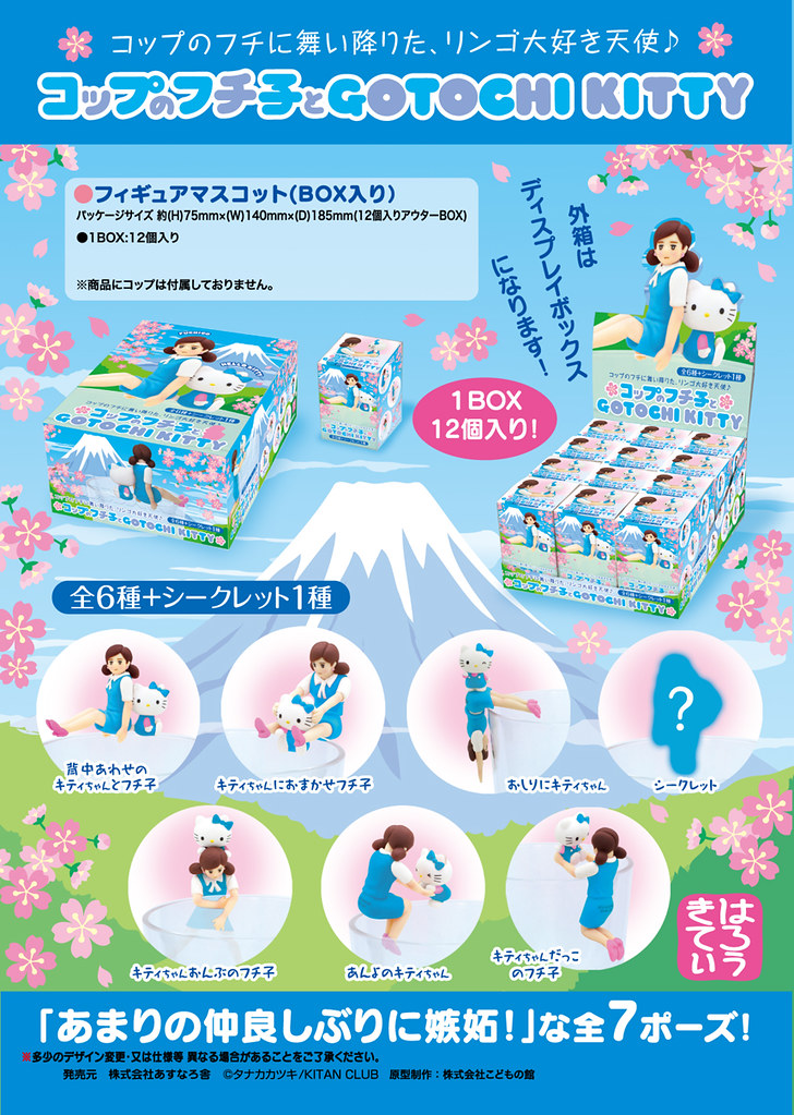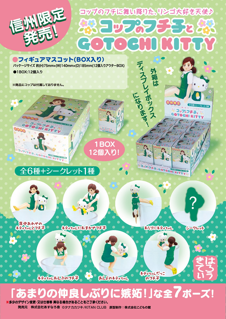兩款全新配色分別為以信州大自然為發想的綠色版「コップのフチ子とGOTOCHI KITTY信州」將在長野縣限定販售;而使用富士山意像而設計的藍色版「コップのフチ子とGOTOCHI KITTY富士山」則將在山梨、静岡縣限定發行。兩種配色皆有6 種款式+1隱藏,各位喜愛凱蒂貓迷或杯緣子系列的玩具人,可要費心入手了!~