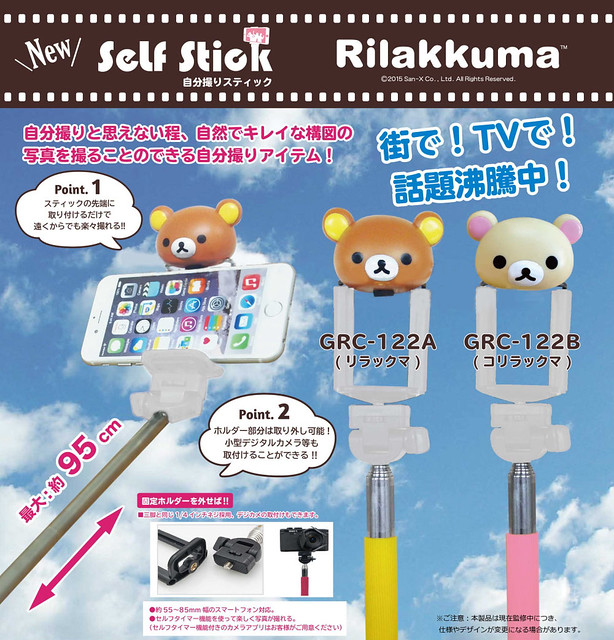 療癒系角色拉拉熊這次將推出新款的リラックマ セルフスティック(自撮りスティック) 拉拉熊自拍棒(暫時翻譯),越來越多人喜歡使用智慧手機的自拍道具,這次由專門製作通信相關產品的gourmandise公司量產,將可愛的拉拉熊裝置在自拍棒前端的位置,讓你自拍的時候可以和拉拉熊對看。