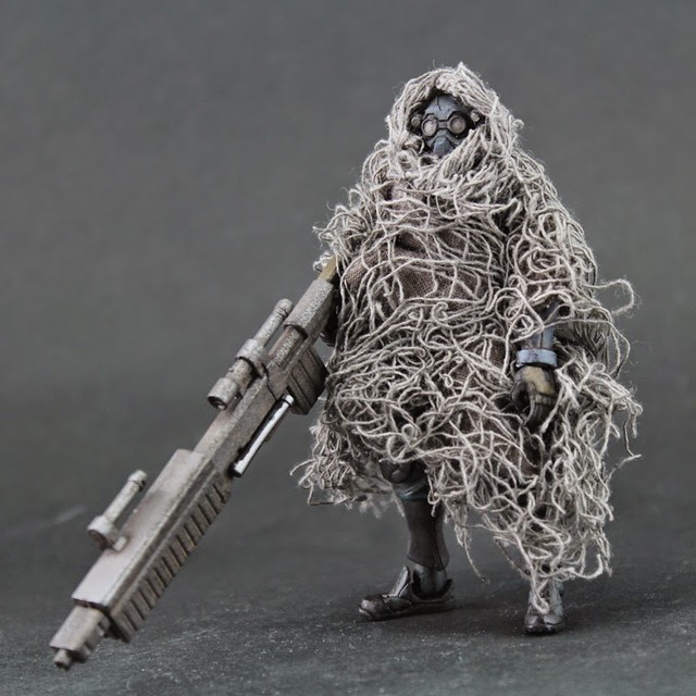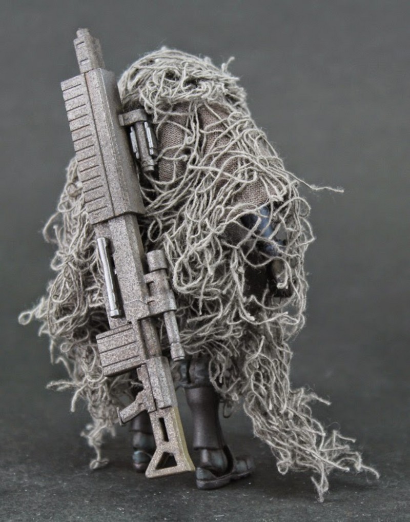 註:吉利服(Ghillie suit),是一種外表跟灌木叢非常相似的偽裝服,由蘇格蘭的獵場看守人所發明,並首度在1899年的第二次波爾戰爭(Second Boer War)中,由蘇格蘭的高地軍團所使用。吉利服採用網與布製作,將表面綴滿搭配周遭環境的葉子與小樹枝,用以視覺欺瞞。
