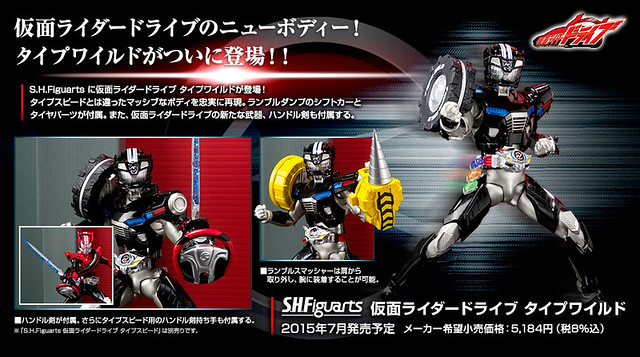 才介紹過假面騎士Drive 技術型號當然仮面ライダードライブタイプワイルド 狂野型號(type Wild)也將推出S.H.Figuarts可動系列商品,假面騎士Drive(仮面ライダードライブ)是2014年10月起於日本朝日電視台放映播出的日本假面騎士系列特攝影集,假面騎士Drive也是該劇主角變身英雄的名稱。