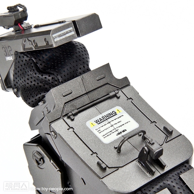 ▼ 這款監視型的「機甲戰犬」在頭頂上所建置的雷射偵測器是配置藍色LED 發光裝置,搭配超讚消光銀的金屬質感,喜歡機械感風格的玩具人不要錯過啦。買了真的不會後悔的!值得一提的是,它裝置電池的部分是在臉部正前面,將蓋子打開即可安裝電池,蓋子是採用磁體吸附的設計方式,所以不用擔心會有零件不見的問題喔!