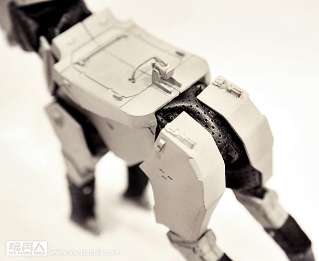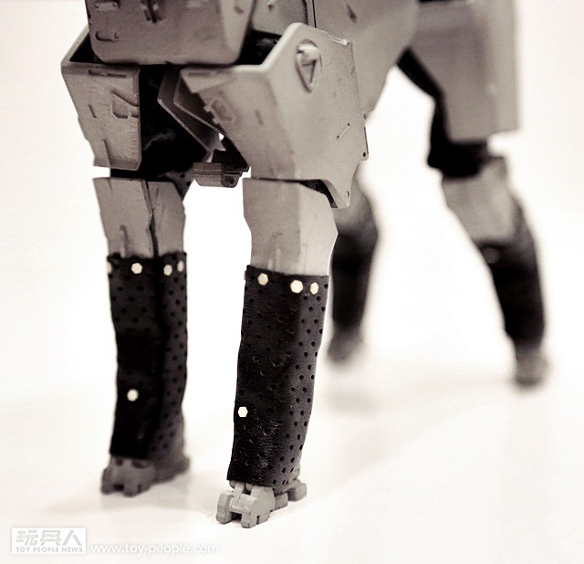 ▼ 各位玩具人可以仔細注意一下,這款機甲戰犬除了身上有許多很細的零件之外,在兩隻前腿的側邊亦有附上扣環,而這個扣環更是可動的,而非只是單純的平面造型。在機甲戰犬腳掌的部分,其在設計上也是可動的,並分為前後兩部份,這個設計無疑是要讓這款機甲戰犬於戰場上監視時能適應各種不同的地形,除了可以平地快速奔走之外,還可以在較崎嶇的山區進行任務。