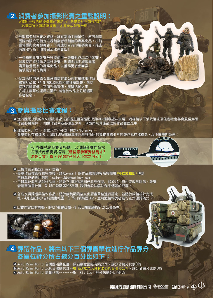*參加者須同意原石創意國際有限公司有權運用作品檔案於ACID RAIN WORLD玩具相關推廣計畫,包括網路活動宣傳、平面刊物宣傳、展覽活動之用,凡經主辦單位運用之圖片,將會於作品上註明攝影作者全名。
