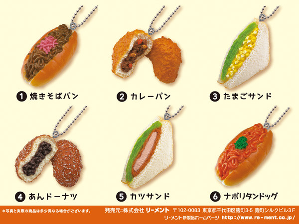 這次「購買部の麵包」系列作品共有六款造型:「炒麵麵包」(焼きそばパン)、「咖哩麵包」(カレーパン)、「雞蛋沙拉三明治」(たまごサンド)、「紅豆甜甜圈」(あんドーナツ)、「豬排三明治」(カツサンド)、「拿坡裡義大利麵包」(ナポリタンドッグ)。每個款式都讓人感到好好吃啊!!買來當項鍊掛在脖子上,立馬吃飽飽(誤~)
