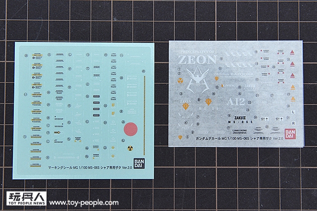 ▼ 在所有細節都入完墨後,MG系列通常都會附上貼紙增加如警示符號或是圖騰LOGO等細節。像左邊這種是一般的擬真貼紙,較厚黏性也較差;而右邊的則是轉印貼紙的一種,感壓轉印貼紙,也就是俗稱的刮刮貼。