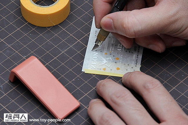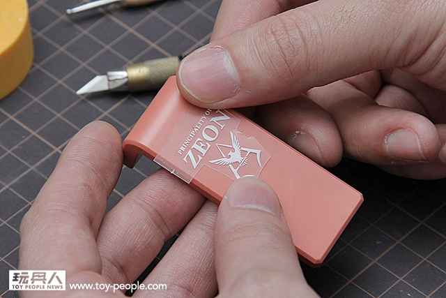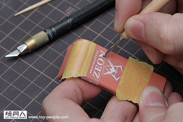 ▼ 接著用筆刀把想要貼的部分切下來。例如我要在這塊肩甲上貼上ZEON的徽章。刮刮貼在取下時,並不需要按照徽章邊緣切齊。但是請不要切到徽章的部分喔。