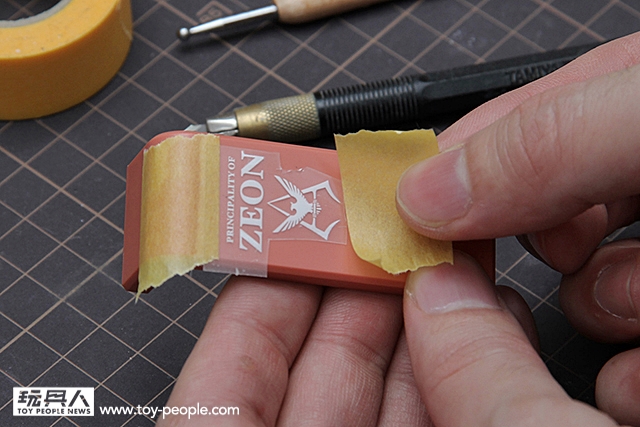 ▼ 再貼上遮蓋膠帶,確認貼紙是拉直服貼在零件的表面上。