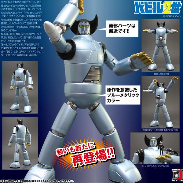 DYNAMITE ACTION!的合金系列各個關節以鐵球和磁鐵來設計製作,腹部和手肘可以配置劇情中出現的魚雷武器,也附有漫畫故事中出現的主要角色超能力少年浩一和夥伴黑豹等等配件,提供給喜歡橫山光輝老師巴比倫2世的玩具人參考!