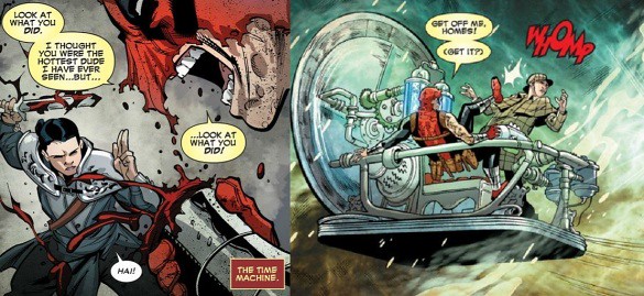 因此死侍偷開走福爾摩斯開來的時光機(赫伯特·喬治·威爾斯小說登場的那台),而福爾摩斯則千鈞一髮之際也坐上去,兩人進行打鬥。
