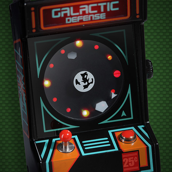 美國知名的阿宅主題商品販售網站“Think Geek”,最近推出了一款經典街機(大型電玩)造型的腕錶,將大型電玩機台縮小製作成手錶,就連搖桿、按鈕以及機台框體,都一次到位。螢幕上的錶面,則是顯示著骨灰級電玩“Galactic Defense”的畫面,將漂流在太空的隕石設計成時、分針,而太空梭則是做成秒針。除此之外,按下按鈕還會發出經典的電玩效果音!