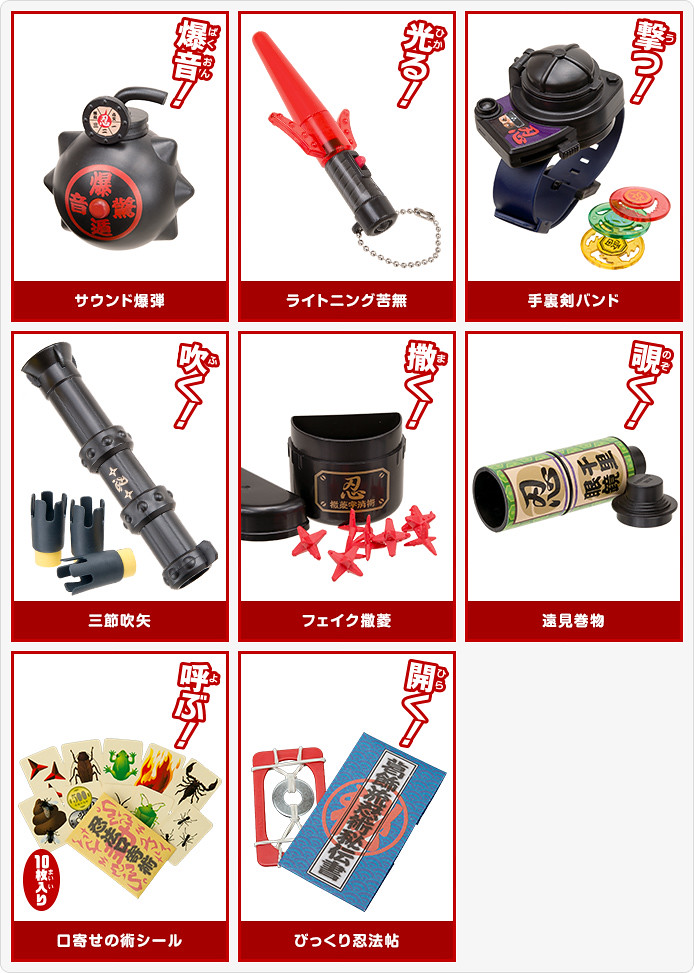 這次「速成忍者高科技忍具組」系列作品共有八款造型:「サウンド爆弾」、「手裏剣バンド」、「フェイク撒菱」、「口寄せの術シール」、「ライトニング苦無」、「三節吹矢」、「遠見巻物」、以及「びっくり忍術帖」。喜愛忍者相關作品的玩具人,請不要錯過這次所推出的忍具小配件囉!