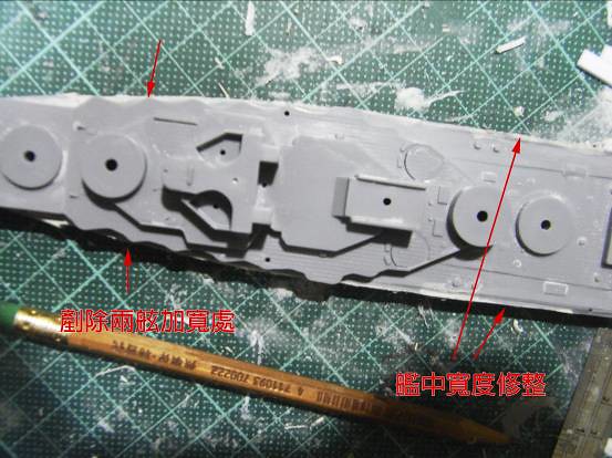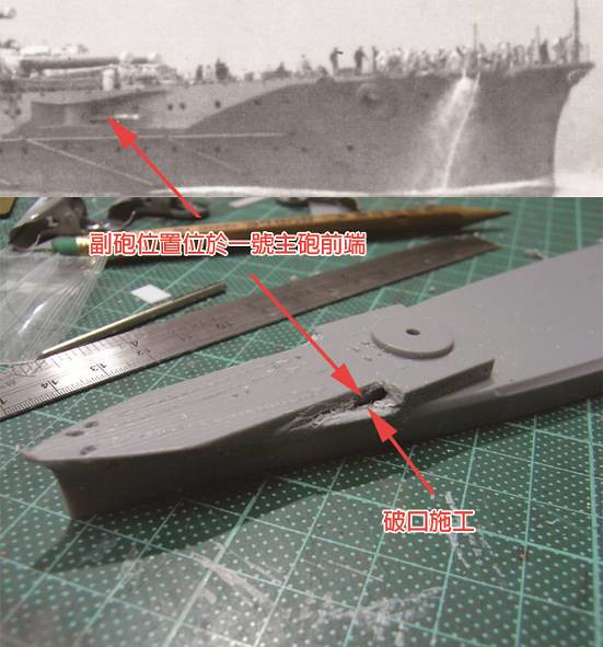 大改裝前的伊勢擁有兩座煙突,因此在這裡必須重現第一煙突,用厚膠版搭出煙突的厚度,再打磨出煙突的形狀