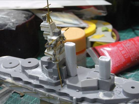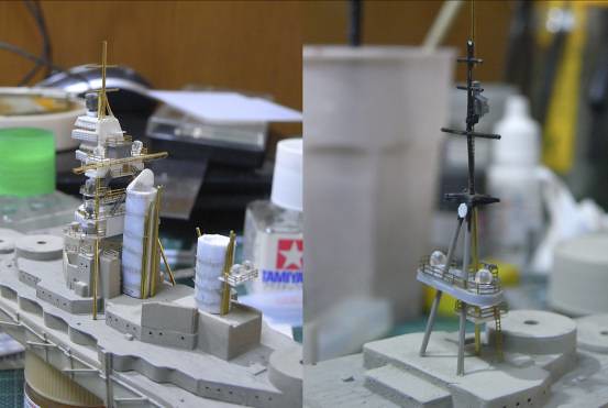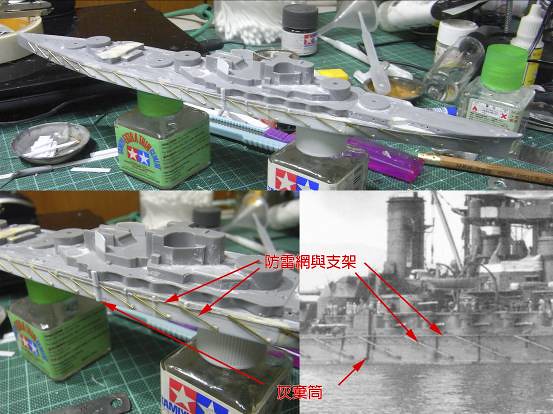 接著根據歷史照片追加舷側的防雷網、支架與管道