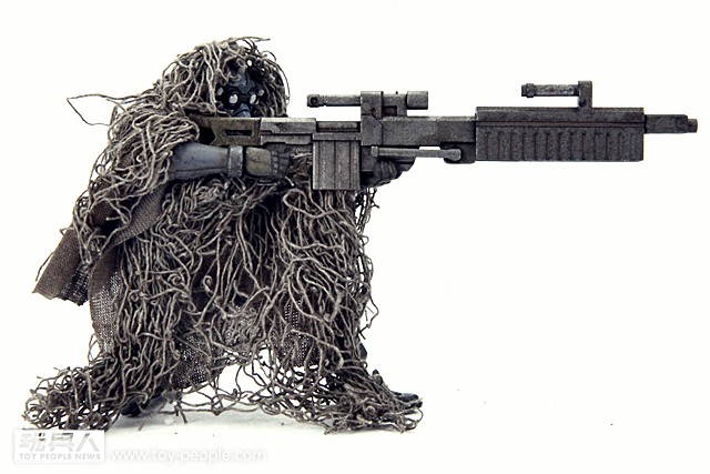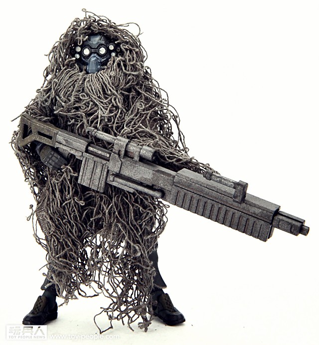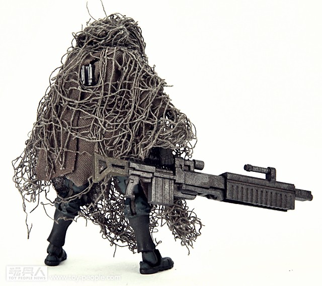 ▼ 平常可以藉由吉利服的偽裝來把身體、臉孔盡量的隱藏起來;不過也能打開,露出四肢方便動作。除此之外,因為配備的是反載具用的超大型槍枝 - 殲滅坦克載具專用的狙擊炮(heavy artillery sniper rifle),所以槍枝上設計了提把,與腳架。
