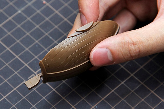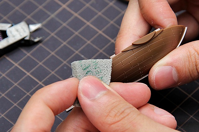 因為船體是圓弧狀,繼續使用研磨版會改變它既有的形狀。所以我們使用綠色的研磨海綿,它的顆粒大小等同田宮研磨砂紙的800~1000號,可以在不改變零件原有造型的情況下,進行研磨拋光的作業。在這步驟,我們只需要略作研磨,將湯口痕跡消除或是變淡不易看見即可。