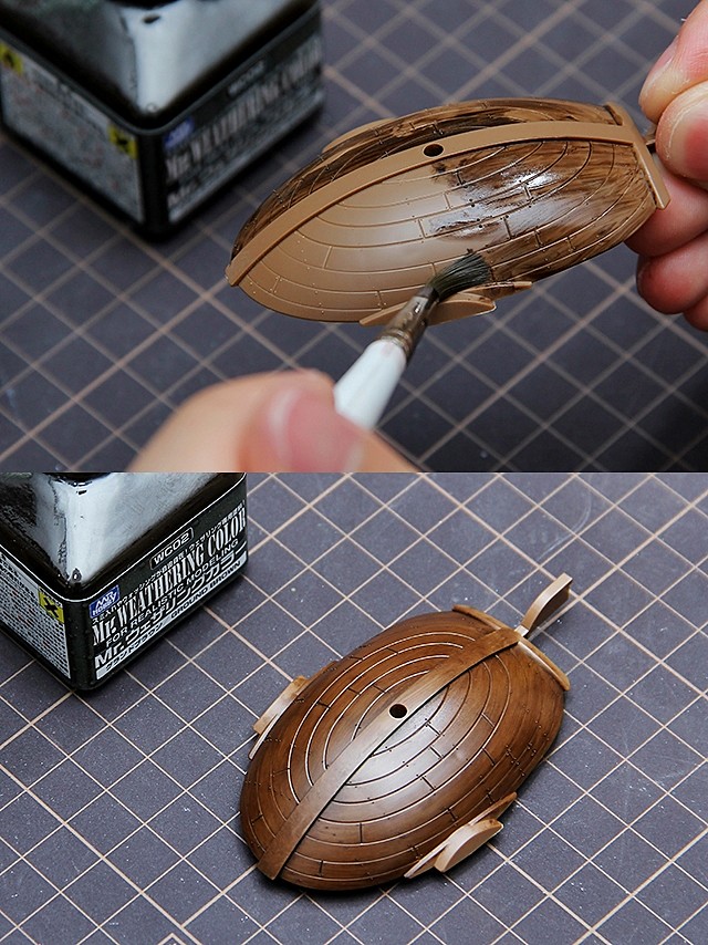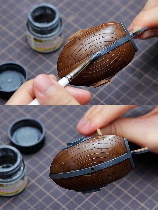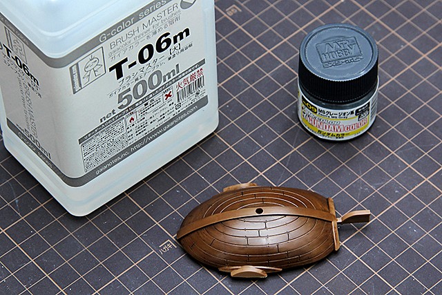 ▼ 在完成千陽號的木頭質感後,我們也要將千陽號的船脊跟「士兵船塢系統」的鐵條上色。繼續使用筆塗技法,而這一次,使用鋼彈專用色的UG09吉翁軍灰色(在設計的選擇上,可以德軍灰系優先)並且搭配筆塗用緩乾溶劑GAIA T-06來稀釋調漆。