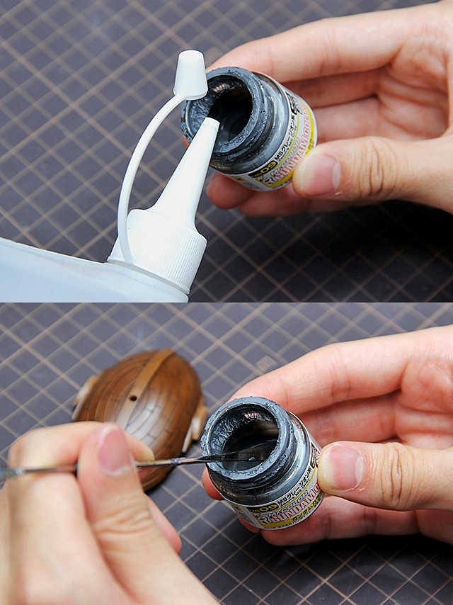 ▼ 筆塗時的調漆完整步驟,我們可以先參考《鋼普拉教室Vol.11 鋼普拉筆塗技上篇 – 基礎上色》。重點步驟就是攪拌漆料、使用溶劑以及漆料跟溶劑比例為1比0.7~1之間。當然有時候,我們的漆料會用到只剩下一點點留在漆料罐中,不好取出,我們就可以直接將溶劑倒入(切記,要注意比例。),接著攪拌均勻後,就可以使用了。