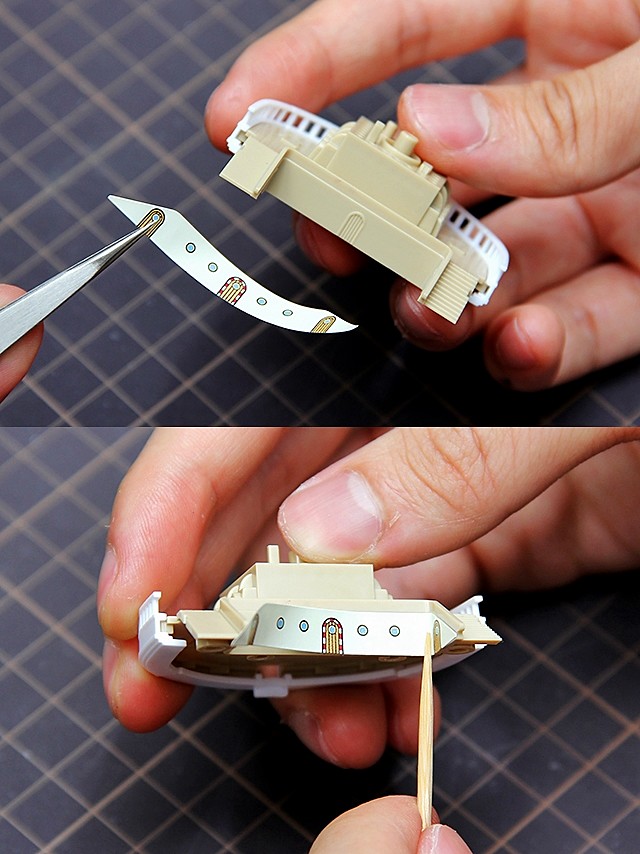▼ 因為是動畫風格的船艦模型,所以還是有很多部分是需要用到貼紙。而貼紙的黏貼方式,我們需要拿鑷子把貼紙取下,減少與黏質接觸的部分。而像這種大張的貼紙,我們可以先從邊緣最小的地方來跟模型對位,對好之後就可以順利地貼上了。