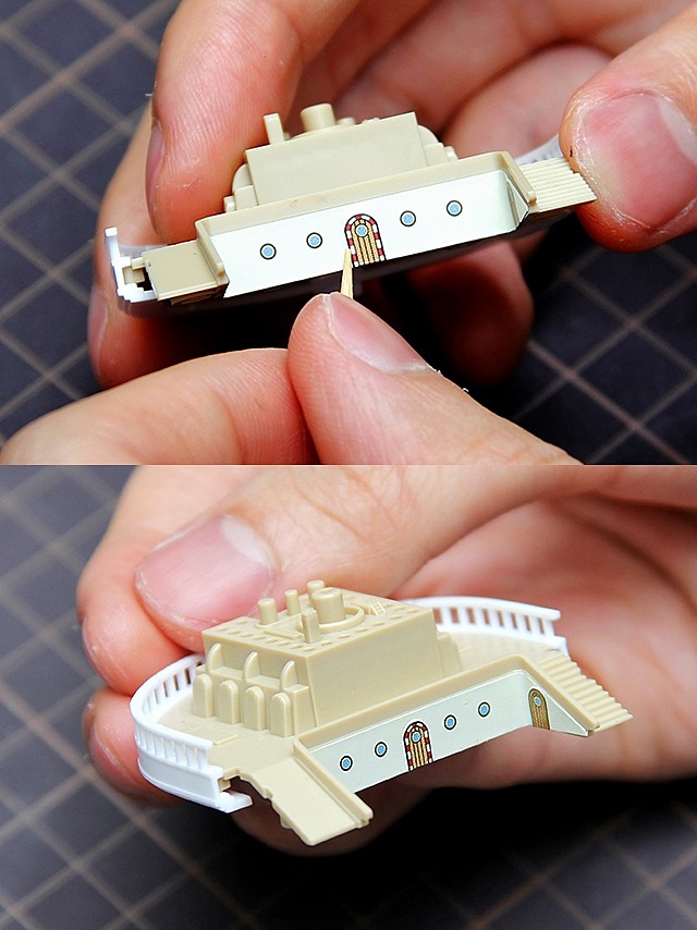 ▼ 而千陽號的貼紙細節,並不是平整的。而是有凹凸的細節,像是門柱。這時候我們可以用牙籤來把細節壓出來,同時把貼紙壓得更扎實。完成之後就更有層次了。