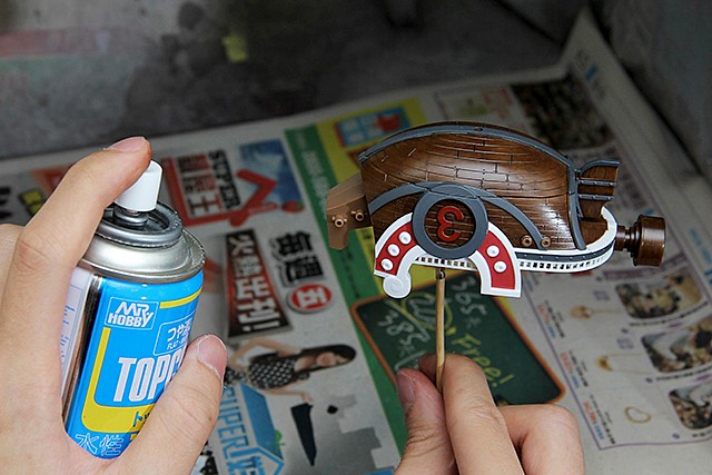 ▼ 完成全部需要筆塗跟需要黏貼貼紙細節的部份後,我們就噴上保護漆,保護我們之前辛苦的結晶。噴上保護漆後,不僅可以減少刮漆的傷害,還可以保護貼紙讓它不容易翹起。保護漆的施作原則,就是保持10~15公分的距離薄噴。(不熟悉施作方法的玩具人們,可以參考《鋼普拉教室 Vol.2 基礎修整篇-下集(全裝備型製作攻擊鋼彈)》)