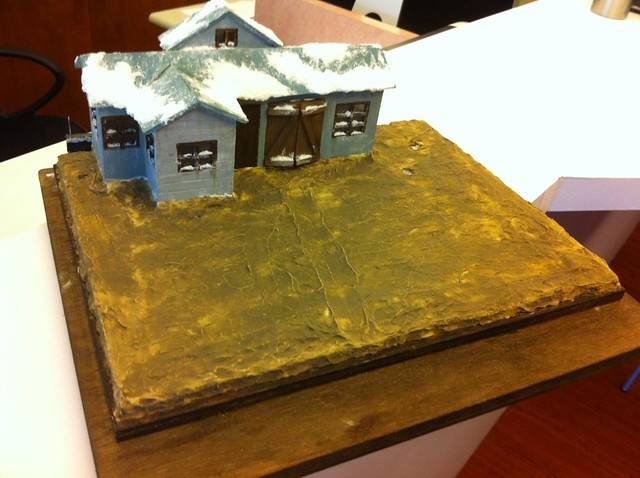 地台先舖上石膏,小屋也上色完成固定於底座石膏上