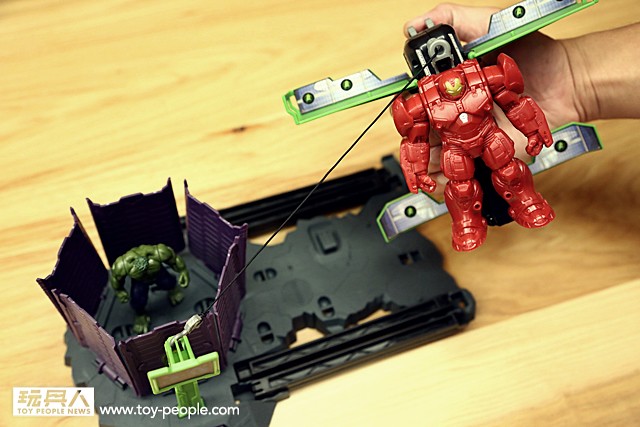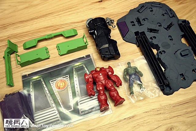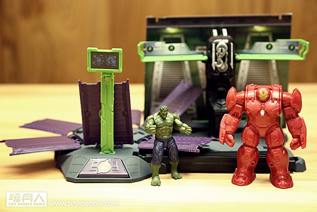 ▼ 第一套是浩克(爆發),以劇中重點的浩克與浩克毀滅者大戰場景為設計。玩具的設計是鋼鐵人藉由衛星鎖定了浩克的位置,空降襲擊了突破(Breakout)囚牢的浩克。