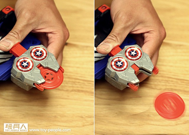 ▼ 場景旁的砲台,按下開關之後能夠高速地將象徵美國隊長盾牌的飛盤高速射出。