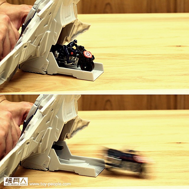 ▼ 組裝之後,2號場景的地台可以向外拉出,讓場景的整體造型比例更好。除此之外,美國隊長的機車能夠有更長的衝刺距離,讓衝擊的效果更棒~