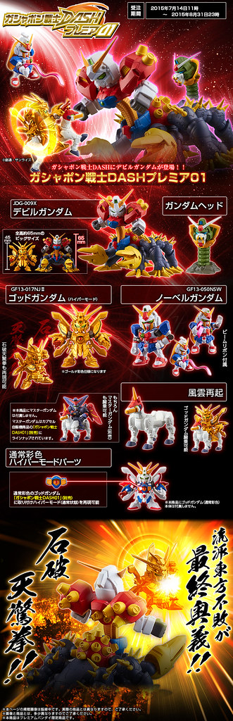『轉蛋戰士 DASH 特別版系列』,第一彈將收錄《機動武鬥傳G鋼彈》中登場,一般轉蛋尺寸難以收錄的大尺寸機體「惡魔鋼彈」,除此之外,還收錄了特殊的「惡魔鋼彈頭」(ガンダムヘッド)、「諾貝爾鋼彈」以及東方不敗的愛駒「風雲再起」。另外還有特殊的金色配色、發動了“超級模式”(Hyper Mode)的“神威鋼彈”,以及可以呈現“神威鋼彈”發動“超級模式”時,胸口零件打開的交換零件。